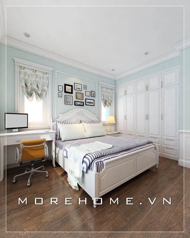 Trang trí nội thất giường ngủ tân cổ điển với gam màu trắng tinh tế cho biệt thự cao cấp