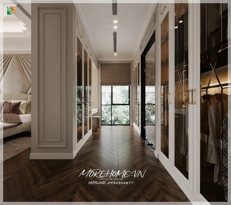 Với phòng ngủ có diện tích lớn như phòng ngủ master pethouse, biệt thự, nhà phố, có thể sử dụng một hệ thống phòng thay đồ với tủ quần áo để phân chia riêng khu vực thay đồ và khu vực nghỉ ngơi như trong mẫu thiết kế phòng ngủ này