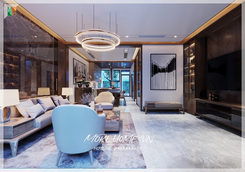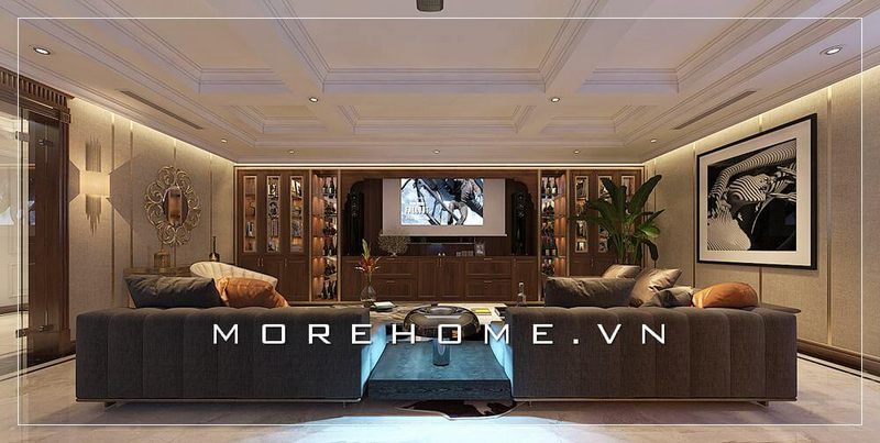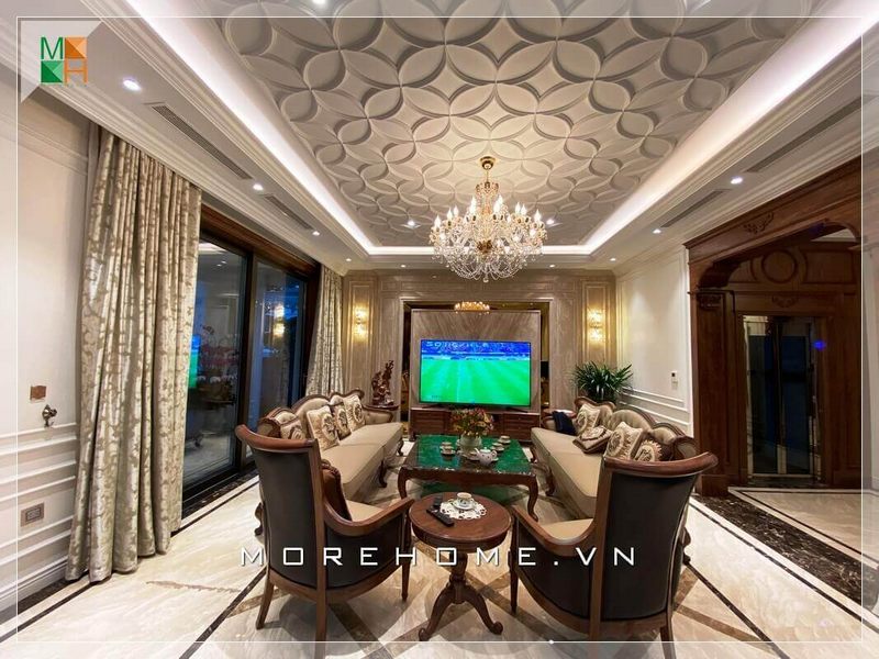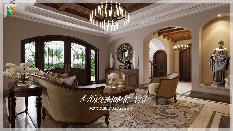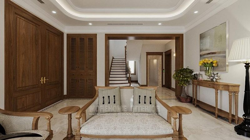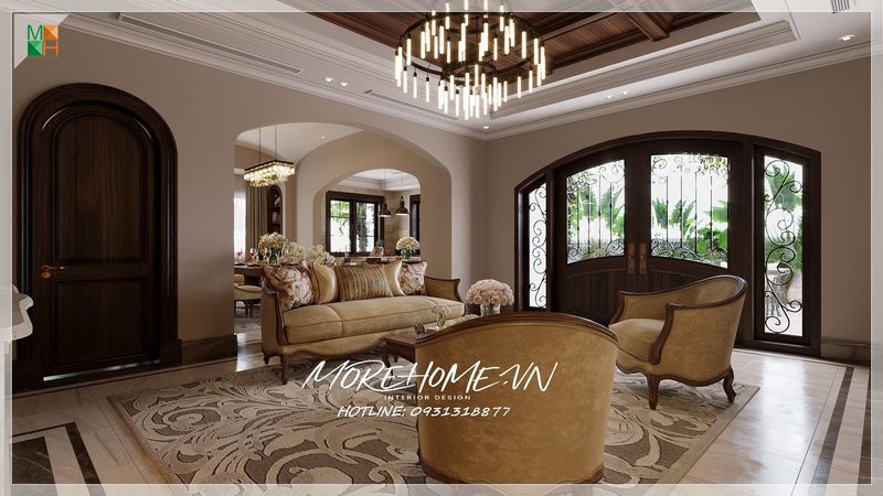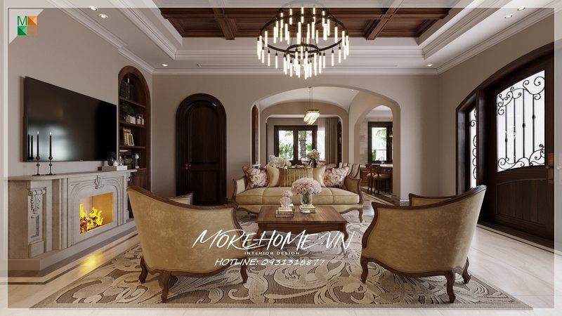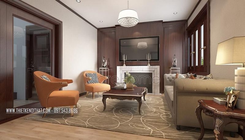Phòng khách biệt thự được thiết kế với phong cách tân cổ điển gỗ óc chó đẹp tiện nghi và sang trọng.