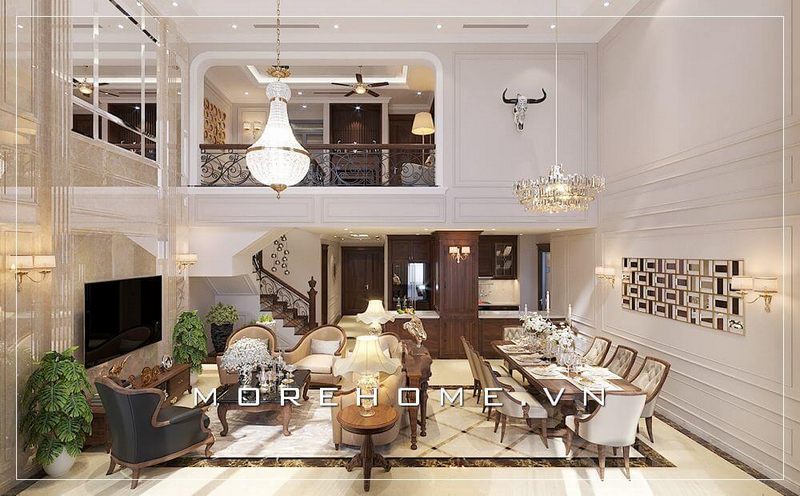 Bố trí không gian phòng khách liền bếp ăn phong cách tân cổ điển đẹp, sang trọng cho biệt thự, nhà phố.