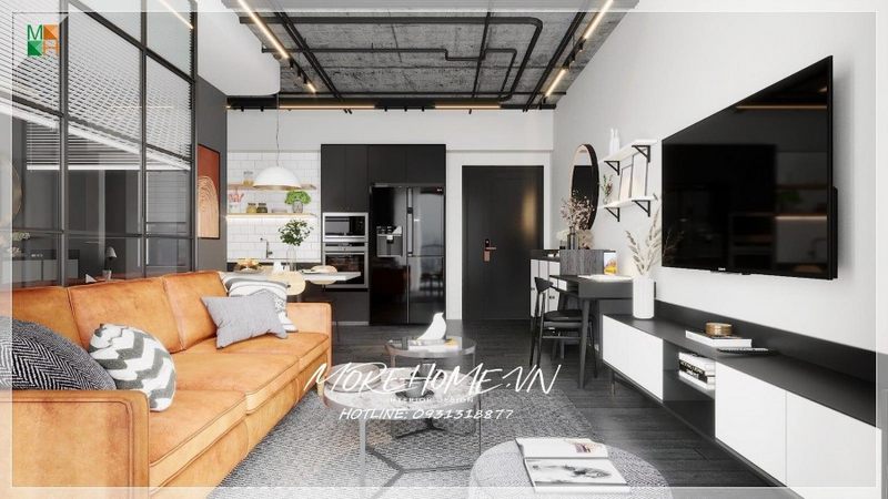 Mẫu thiết kế nội thất phòng khách kết hợp bàn làm việc có cửa sổ lớn hiện đại và tiện lợi cho chung cư, nhà phố.
