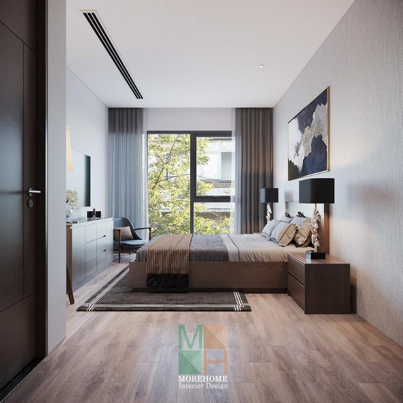 Mẫu thiết kế nội thất phòng ngủ nam tính dùng giường gỗ óc chó veneer hiện đại, liền mạch với tấm gỗ ốp tường hiện đại, được bố trí chiếm toàn bộ diện tích mảng tường dưới để tạo nên một không gian đẹp và thuận tiện cho việc vệ sinh, đặc biệt là phòng của cậu con trai.