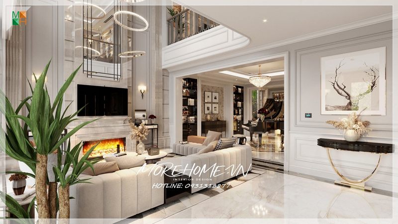 Không gian phòng khách thông tầng có đàn piano được trang trí bằng tông màu sáng làm chủ đạo, tạo nên 1 không gian với phong cách hiện đại rất đẹp.
